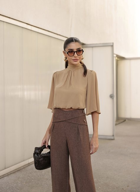Gola alta com amarração nas costas, que traz um ar romântico e elegante, além de valorizar o pescoço e as costas com sofisticação. Elástico na barra que ajusta suavemente à cintura, criando um caimento soltinho no corpo e valorizando a silhueta. Mangas evasê 3/4, levemente amplas, com caimento fluido que confere leveza e movimento à peça. Tecido leve e confortável, com excelente toque na pele e caimento impecável. Disponível em uma paleta de cores sofisticadas que se adaptam a diferentes estilos e estações.