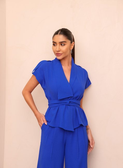 A blusa apresenta uma gola assimétrica que é o destaque do design. Este detalhe criativo adiciona um elemento de surpresa e sofisticação, com uma linha de gola que pode variar desde um recorte diagonal até um design mais assimétrico e fluído. A gola assimétrica confere um toque moderno e artístico à peça, criando um ponto focal que destaca a elegância do colo e o contorno do rosto. A blusa é complementada por uma faixa na cintura que proporciona um ajuste ajustável e uma silhueta mais definida. A faixa pode ser do mesmo tecido da blusa ou em um material coordenado, como um cinto de couro ou uma faixa de tecido contrastante. A faixa é projetada para ser amarrada ou fixada em um laço elegante, permitindo que você ajuste a blusa de acordo com seu estilo e conforto, acentuando a cintura e criando uma linha fluida. A blusa é confeccionada em um tecido de alta qualidade, um crepe estruturado. O caimento da blusa é projetado para ser leve e confortável, permitindo que se ajuste perfeitamente ao corpo enquanto mantém uma forma elegante e sofisticada. O tecido contribui para o visual geral, garantindo um toque suave e um drapeado fluído. As mangas da blusa curtas cuidadosamente elaborado para complementar a gola assimétrica e a faixa na cintura, garantindo um visual harmonioso.