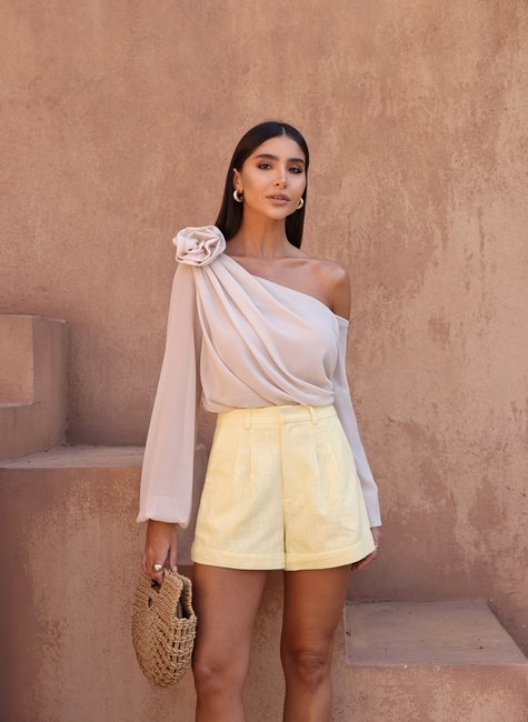 Finalize com brincos marcantes ou clutch estruturada para destacar ainda mais o ombro único com flor.