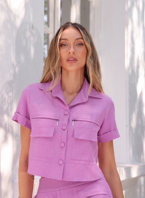 O design da camisa é realçado pelos botões forrados, que proporcionam um toque de requinte e uma aparência limpa e sofisticada. As mangas curtas são ideais para climas mais quentes, mantendo você fresca e confortável, sem abrir mão do estilo.