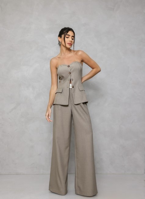A calça é projetada com um corte de alfaiataria impecável, oferecendo uma silhueta ajustada que valoriza a forma feminina. O corte é estruturado e ajustado, proporcionando um caimento elegante que se adapta ao corpo de maneira sofisticada. O modelo do corte reto. O cós da calça é um destaque com seu pesponto que adiciona um contraste sutil e elegante ao design. é uma linha de costura decorativa que não só reforça a estrutura do cós, mas também oferece um toque visual de sofisticação. Este detalhe proporciona um acabamento refinado e um toque de originalidade ao visual clássico da calça. Confeccionada em um tecido de alta qualidade, oferece um caimento fluido e confortável. O tecido é escolhido para garantir uma boa estrutura e durabilidade, mantendo a forma ao longo do dia e proporcionando um visual polido. O fecho pode ser feito com zíper e ganchos internos garantindo um ajuste seguro e uma linha limpa na parte frontal.