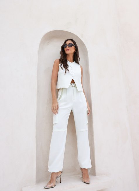 A calça cargo é confeccionada em um tecido texturizado que oferece um visual sofisticado e contemporâneo. A textura adiciona profundidade e interesse ao tecido, tornando a peça mais atraente e visualmente rica. Esse tipo de acabamento também ajuda a disfarçar pequenas imperfeições e a criar um efeito mais dinâmico. Inclui um cinto ajustável que complementa o design da calça. O cinto pode ser usado para definir a cintura e adicionar um toque de estilo. Feito do mesmo material coordenado com a calça, ele oferece um ajuste personalizado e garante que a peça se mantenha no lugar com elegância. As pernas da calça possuem elásticos discretos na barra, permitindo um ajuste ajustável e personalizado. Esse detalhe não só proporciona um caimento ajustado, mas também adiciona um elemento moderno e funcional, permitindo que você ajuste o comprimento das pernas conforme necessário para um visual mais customizado. A calça é equipada com bolsos cargo funcionais, estrategicamente posicionados nas laterais das coxas. Estes bolsos, com abas são ideais para armazenar pequenos itens de forma prática. Além de sua funcionalidade, os bolsos adicionam um toque de estilo utilitário ao design.