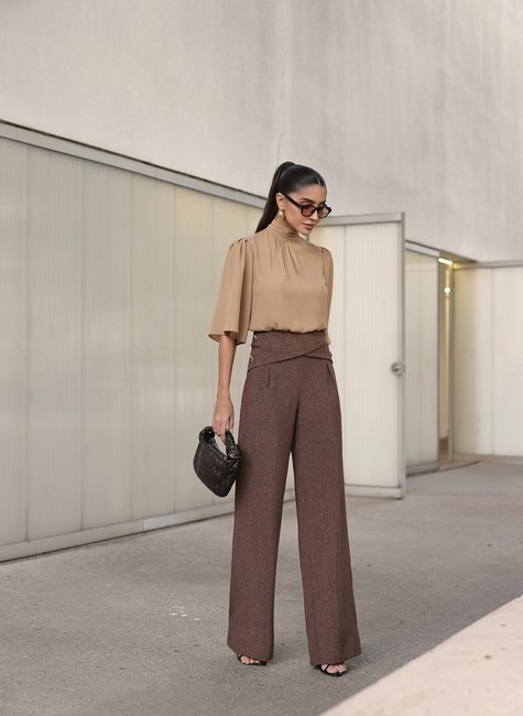 A modelagem pantalona de cintura alta valoriza o corpo, criando uma silhueta mais alongada e elegante. O detalhe cruzado na cintura marca o shape com charme e modernidade, enquanto o corte reto garante sofisticação. Perfeita para todos os biotipos.