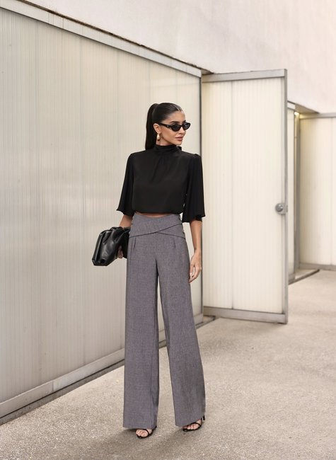A modelagem pantalona de cintura alta valoriza o corpo, criando uma silhueta mais alongada e elegante. O detalhe cruzado na cintura marca o shape com charme e modernidade, enquanto o corte reto garante sofisticação. Perfeita para todos os biotipos.