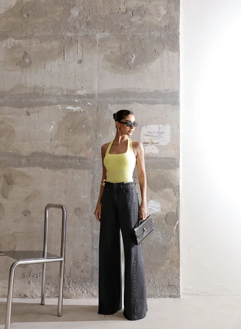 A modelagem flare equilibra as proporções do corpo, alonga as pernas e valoriza as curvas. O cós desfiado adiciona personalidade sem perder a elegância, tornando a peça versátil para diferentes estilos.
