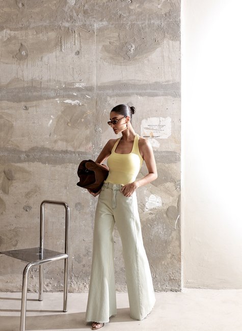 A modelagem flare equilibra as proporções do corpo, alonga as pernas e valoriza as curvas. O cós desfiado adiciona personalidade sem perder a elegância, tornando a peça versátil para diferentes estilos.