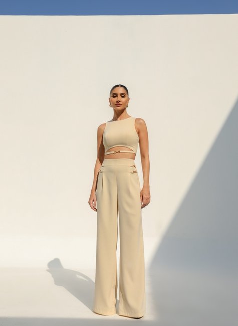 O design da calça é complementado por uma ampla perna pantalona, que adiciona um toque de dramaticidade e movimento a cada passo. O corte amplo e estruturado proporciona um visual elegante e deslumbrante, ideal para diversas ocasiões, desde eventos formais até encontros casuais com um toque de sofisticação. O verdadeiro destaque da peça está nas fivelinhas delicadas posicionadas nas laterais. Estas fivelas, meticulosamente trabalhadas, adicionam um brilho sutil e um charme extra ao design da calça. Elas são discretamente inseridas nas laterais, criando um ponto focal sofisticado e conferindo um toque de modernidade à peça clássica. A combinação de acabamento metálico e o tecido de alta qualidade garante que as fivelas se integrem de maneira harmoniosa e elegante ao visual geral. Com uma cintura bem estruturada e um fecho discreto em zíper nas costas, a calça pantalona de alfaiataria é projetada para proporcionar conforto e ajuste perfeito.