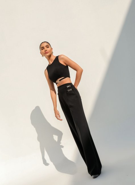 O design da calça é complementado por uma ampla perna pantalona, que adiciona um toque de dramaticidade e movimento a cada passo. O corte amplo e estruturado proporciona um visual elegante e deslumbrante, ideal para diversas ocasiões, desde eventos formais até encontros casuais com um toque de sofisticação. O verdadeiro destaque da peça está nas fivelinhas delicadas posicionadas nas laterais. Estas fivelas, meticulosamente trabalhadas, adicionam um brilho sutil e um charme extra ao design da calça. Elas são discretamente inseridas nas laterais, criando um ponto focal sofisticado e conferindo um toque de modernidade à peça clássica. A combinação de acabamento metálico e o tecido de alta qualidade garante que as fivelas se integrem de maneira harmoniosa e elegante ao visual geral. Com uma cintura bem estruturada e um fecho discreto em zíper nas costas, a calça pantalona de alfaiataria é projetada para proporcionar conforto e ajuste perfeito.