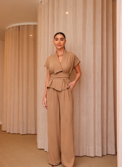 Combine a calça pantalona com uma camisa de seda ou uma blusa de botão ajustada para um visual profissional e sofisticado. O cós assimétrico adiciona um toque de inovação ao visual de escritório, enquanto o corte pantalona proporciona conforto e elegância. Complete com um blazer estruturado e sapatos de salto médio ou mocassins para um look de trabalho refinado. Para um evento formal, como um coquetel ou um jantar, use a calça com um top sofisticado, como um body de renda ou uma blusa com detalhes metálicos. O cós assimétrico e o corte pantalona criam uma silhueta elegante e impactante. Adicione saltos altos e uma clutch elegante para um toque de glamour e sofisticação. Para um estilo casual chic, combine a calça com uma camiseta básica ou um suéter leve. O design assimétrico da cintura e o corte fluído adicionam um elemento de estilo ao visual casual. Complete com tênis brancos ou sandálias de tiras e uma bolsa casual para um look relaxado e moderno. Para uma saída noturna, escolha um top mais ousado, como um top de cetim ou um top com brilho. O cós assimétrico e o corte pantalona oferecem uma base elegante para um visual noturno sofisticado. Finalize com saltos altos e uma bolsa de mão glamourosa para um look impactante e deslumbrante