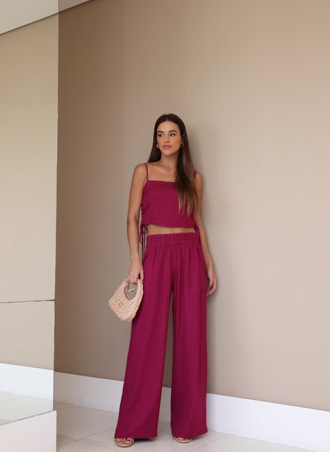 O design da pantalona destaca-se pelo cós de elástico, que garante um ajuste confortável e prático, permitindo liberdade de movimento durante todo o dia. Esse detalhe também adiciona um toque contemporâneo ao modelo, tornando-o ideal para diferentes ocasiões, desde eventos casuais até compromissos mais formais.