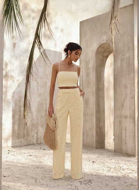 Combine com o cropped coordenado da mesma cor para um look monocromático moderno e fresh. Também vai muito bem com camisas de linho, regatas ajustadas ou blusas de alça fina. Aposte em sandálias de salto bloco ou rasteiras para finalizar.