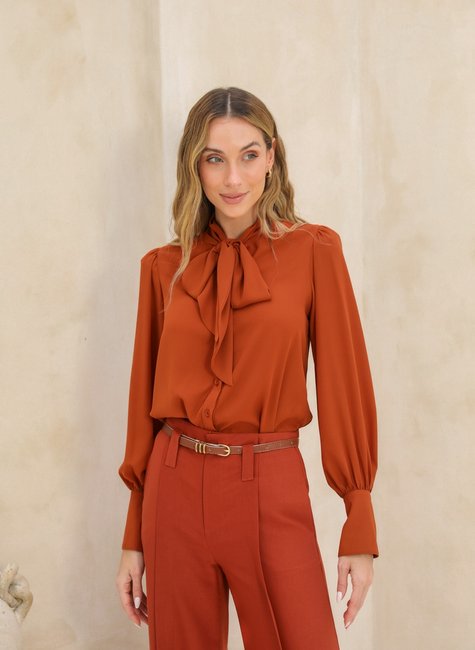 Para um Look Formal: Combine a camisa com uma saia lápis ou calças de alfaiataria e sapatos de salto alto. O laço na gola adiciona um toque de sofisticação ao visual formal, tornando-o perfeito para ambientes de trabalho ou eventos profissionais. Para uma Ocasião Casual-Chic: Use a camisa com jeans de cintura alta e mocassins ou sapatilhas. O laço e o crepe criam um visual contemporâneo e elegante, ideal para um look casual-chic que é ao mesmo tempo confortável e estiloso. Para uma Saída Noturna: Experimente a camisa com uma saia de couro ou calças justas e finalize com saltos altos e acessórios glamourosos. O laço na gola e o tecido de crepe proporcionam um visual sofisticado e encantador, ideal para eventos noturnos e festas.