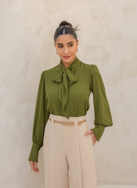 Para um Look Formal: Combine a camisa com uma saia lápis ou calças de alfaiataria e sapatos de salto alto. O laço na gola adiciona um toque de sofisticação ao visual formal, tornando-o perfeito para ambientes de trabalho ou eventos profissionais. Para uma Ocasião Casual-Chic: Use a camisa com jeans de cintura alta e mocassins ou sapatilhas. O laço e o crepe criam um visual contemporâneo e elegante, ideal para um look casual-chic que é ao mesmo tempo confortável e estiloso. Para uma Saída Noturna: Experimente a camisa com uma saia de couro ou calças justas e finalize com saltos altos e acessórios glamourosos. O laço na gola e o tecido de crepe proporcionam um visual sofisticado e encantador, ideal para eventos noturnos e festas.
