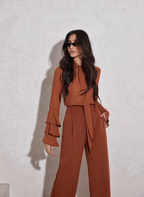 Com modelagem reta e sofisticada, ela transita com facilidade entre o office look e ocasiões mais formais. O tom terroso traz elegância atemporal e combina perfeitamente com tons neutros ou contrastantes.