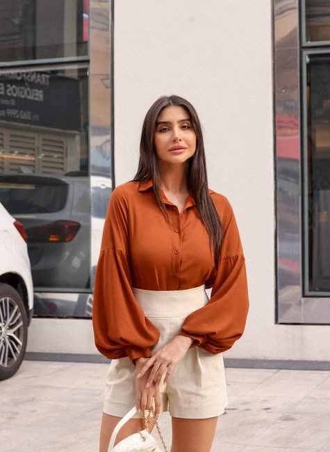 Para um Look Formal: Combine a camisa com uma saia midi evasê ou calças de alfaiataria e sapatos de salto alto. Adicione acessórios sofisticados, como brincos de pérola ou uma clutch elegante, para um visual impactante e refinado. Para uma Ocasião Especial: Use a camisa com uma saia lápis ou calças justas e finalize com sandálias de tiras finas ou sapatilhas elegantes. A combinação cria um look encantador e sofisticado, ideal para eventos noturnos ou festas. Para um Look Casual-Chic: Experimente a camisa com jeans de cintura alta e mocassins ou sandálias. O efeito balonê das mangas adiciona um toque de charme ao visual casual, tornando-o moderno e estiloso.