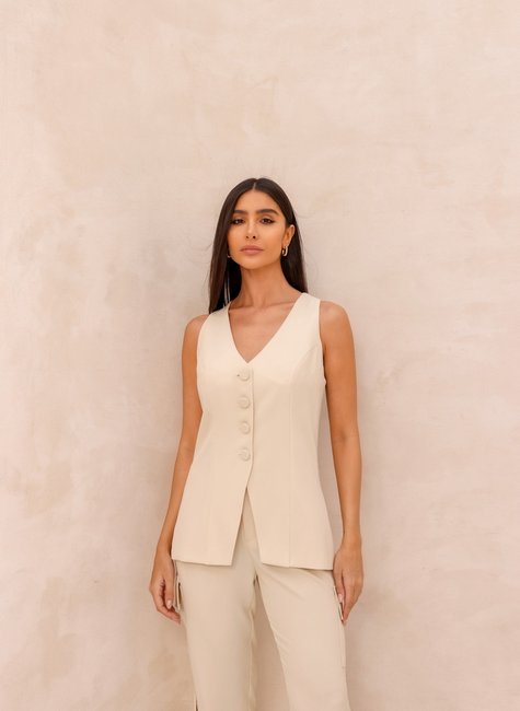 O colete de alfaiataria possui um corte estruturado e refinado, ajustado ao corpo para um caimento elegante. Ele é projetado com linhas limpas e detalhes que destacam um visual sofisticado e profissional. O comprimento do colete um pouco abaixo, proporcionando um ajuste polido e permitindo sobreposição fácil sobre camisas ou blusas. Feito de tecidos de alta qualidade colete de alfaiataria oferece uma textura suave e um caimento impecável. Possui um forro interno que proporciona um acabamento mais sofisticado e conforto adicional. O tecido é liso e bem estruturado, com acabamentos refinados que evitam rugas e garantem um aspecto polido. O colete tem um fechamento frontal com botões forrados do mesmo tecido.