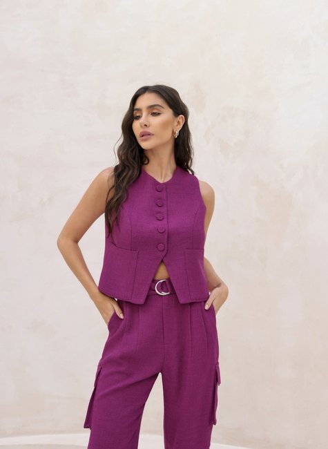 O colete é feito de um tecido com uma textura rica e intrigante, que pode variar desde um padrão sutilmente texturizado até um acabamento mais marcante. A textura adiciona um toque de sofisticação e diferencia o colete de peças mais lisas, criando um visual visualmente atraente e moderno. Os botões do colete são cuidadosamente forrados com o mesmo tecido do colete, proporcionando uma aparência uniforme e refinada. Este detalhe confere um toque de elegância discreta, mantendo a estética limpa e sofisticada. O acabamento forrado dos botões também contribui para um visual mais coeso e integrado. O colete conta com bolsos estrategicamente posicionados, que não apenas oferecem funcionalidade, mas também adicionam um elemento de praticidade ao design. Os bolsos são geralmente inseridos de forma discreta, proporcionando um acabamento polido e mantendo a linha do colete elegante e sem sobrecarga visual.