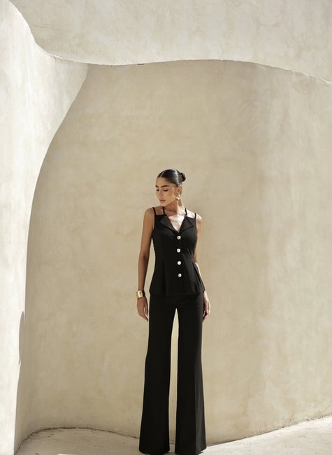 Conjunto em alfaiataria estruturada, com caimento impecável