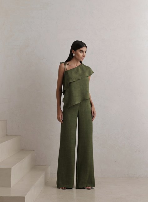 Blusa com decote único e amarração no ombro, formando uma assimetria fluida e elegante. Detalhe em babado diagonal na parte frontal, que agrega volume e movimento com sofisticação. Modelagem reta na calça, com cintura levemente alta e caimento solto até a barra. Tecido texturizado com toque macio, que não marca e valoriza diferentes silhuetas. Acabamento de alfaiataria: estruturado, mas leve – perfeito para visuais mais elaborados.