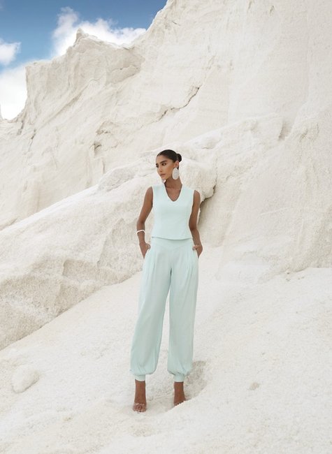 A blusa apresenta decote em V e costas abertas, detalhe que valoriza a silhueta de forma moderna e feminina. A calça possui cintura média, bolsos frontais e barra ajustada, criando um visual contemporâneo e equilibrado entre o casual e o chic. O tecido tem toque suave e movimento natural, garantindo leveza em cada passo.