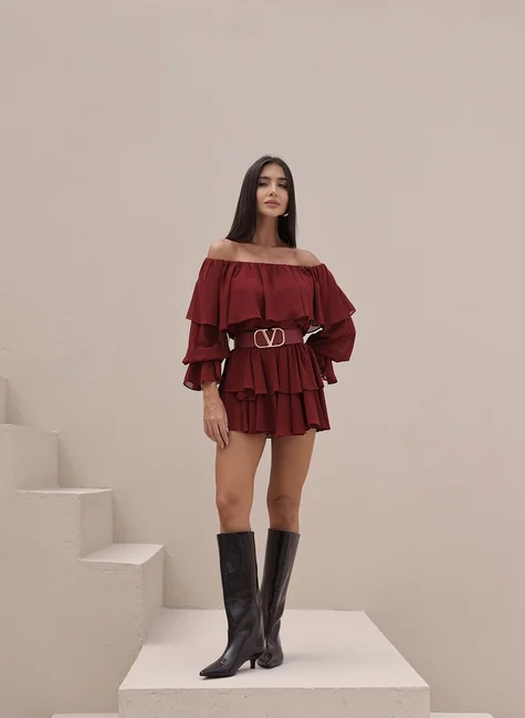 Confeccionada em tecido fluido e de toque suave, a blusa possui decote ombro a ombro com elástico, proporcionando ajuste confortável e valorizando o colo com feminilidade. O detalhe de babado amplo na parte superior adiciona movimento e delicadeza à peça, enquanto as mangas 3/4 bufantes com acabamento em leve babado garantem um toque boêmio e sofisticado. A parte inferior do conjunto é um shorts saia com sobreposição de babados que remetem ao visual de uma mini saia. O modelo é prático e confortável, perfeito para se movimentar com segurança sem perder o charme. O caimento leve e o acabamento fluido acompanham o movimento do corpo, reforçando a estética boho com um toque moderno.