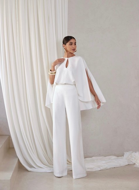 Elegante, leve e super chic! A blusa com abertura em gota e mangas tipo capa traz movimento e sofisticação. A calça alfaiatada completa o look com caimento impecável.