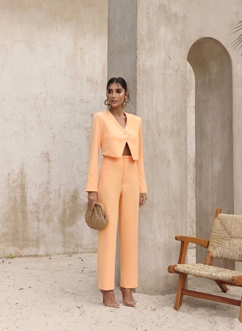 Acompanha um blazer cropped estruturado, com botão único frontal e gola assimétrica que valoriza o colo e cria uma proposta contemporânea. O tom pêssego suave ilumina a produção, sendo uma escolha versátil para eventos, jantares, ou produções fashionistas com salto ou até tênis.