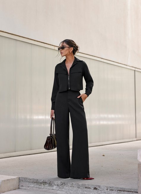 Modelagem cropped reta, com caimento estruturado que valoriza o shape de forma elegante. Detalhe de zíper frontal visível, que confere modernidade e praticidade à peça. Gola de alfaiataria tradicional, adicionando um toque formal e sofisticado. Bolsos frontais com lapela que criam um visual utilitário chique. Manga longa com punho ajustado, que mantém a elegância do look completo. Calça: Modelagem reta ampla, ideal para alongar a silhueta e garantir sofisticação ao caminhar. Confeccionada em tecido com leve textura acetinada, elegante e sutil ao toque. Cintura média com fechamento embutido, que proporciona um acabamento limpo e refinado. Perfeita para ocasiões que exigem uma presença marcante e ao mesmo tempo descomplicada.icia deserunt mollit anim id est laborum. Lorem ipsum dolor sit amet, consectetur adipiscing elit, sed do eiusmod tempor incididunt ut labore et dolore magna aliqua. Ut enim ad minim veniam, quis nostrud exercitation ullamco laboris nisi ut aliquip ex ea commodo consequat.