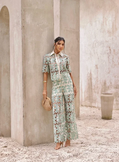 A camisa de manga curta com gola estruturada e botões frontais traz uma mistura de clássico com moderno. A calça possui modelagem reta e comprimento alongado, valorizando a silhueta com leveza e imponência. Ambas as peças são forradas com hot pants e top interno, proporcionando conforto e discrição na medida certa. Confeccionado em renda guipir floral com textura e transparência controlada