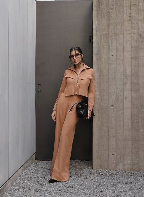 Modelagem cropped reta, com caimento estruturado que valoriza o shape de forma elegante. Detalhe de zíper frontal visível, que confere modernidade e praticidade à peça. Gola de alfaiataria tradicional, adicionando um toque formal e sofisticado. Bolsos frontais com lapela que criam um visual utilitário chique. Manga longa com punho ajustado, que mantém a elegância do look completo. Calça: Modelagem reta ampla, ideal para alongar a silhueta e garantir sofisticação ao caminhar. Confeccionada em tecido com leve textura acetinada, elegante e sutil ao toque. Cintura média com fechamento embutido, que proporciona um acabamento limpo e refinado. Perfeita para ocasiões que exigem uma presença marcante e ao mesmo tempo descomplicada.icia deserunt mollit anim id est laborum. Lorem ipsum dolor sit amet, consectetur adipiscing elit, sed do eiusmod tempor incididunt ut labore et dolore magna aliqua. Ut enim ad minim veniam, quis nostrud exercitation ullamco laboris nisi ut aliquip ex ea commodo consequat.