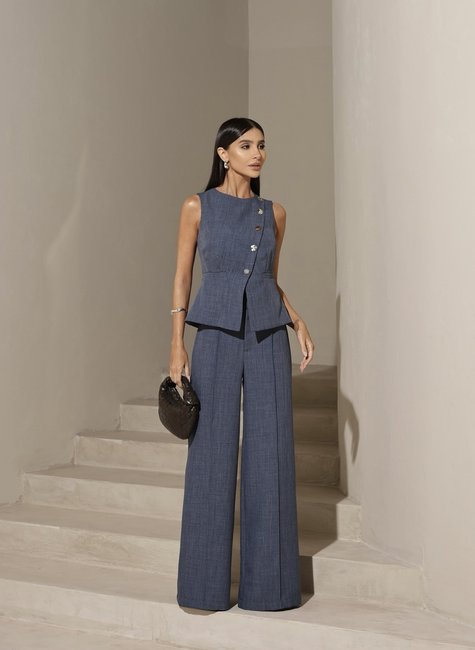 Use o conjunto completo para um look poderoso e monocromático ou combine as peças separadamente — o colete com jeans para um visual moderno, ou a calça com camisas leves para o office look.