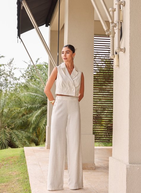 Tecido Premium: Feito em uma mistura de viscose, poliéster e linho, que proporciona leveza, caimento impecável e uma textura única. Colete: Possui um design estruturado com fechamento por botões forrados, conferindo charme e acabamento refinado. Calça Pantalona: A modelagem ampla garante conforto e movimento, criando uma silhueta alongada e fluida.