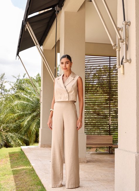 Tecido Premium: Feito em uma mistura de viscose, poliéster e linho, que proporciona leveza, caimento impecável e uma textura única. Colete: Possui um design estruturado com fechamento por botões forrados, conferindo charme e acabamento refinado. Calça Pantalona: A modelagem ampla garante conforto e movimento, criando uma silhueta alongada e fluida.