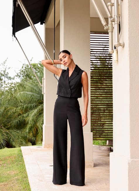 Tecido Premium: Feito em uma mistura de viscose, poliéster e linho, que proporciona leveza, caimento impecável e uma textura única. Colete: Possui um design estruturado com fechamento por botões forrados, conferindo charme e acabamento refinado. Calça Pantalona: A modelagem ampla garante conforto e movimento, criando uma silhueta alongada e fluida.