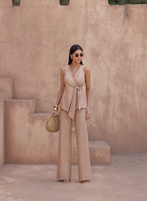 O Conjunto Colete Transpasse da DOT traz elegância contemporânea em um design que combina perfeitamente o clássico com o moderno. Em tom verde menta com listras verticais sutis, a peça alonga a silhueta e garante presença marcante com suavidade.
