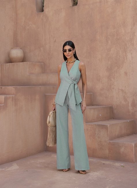 O Conjunto Colete Transpasse da DOT traz elegância contemporânea em um design que combina perfeitamente o clássico com o moderno. Em tom verde menta com listras verticais sutis, a peça alonga a silhueta e garante presença marcante com suavidade.