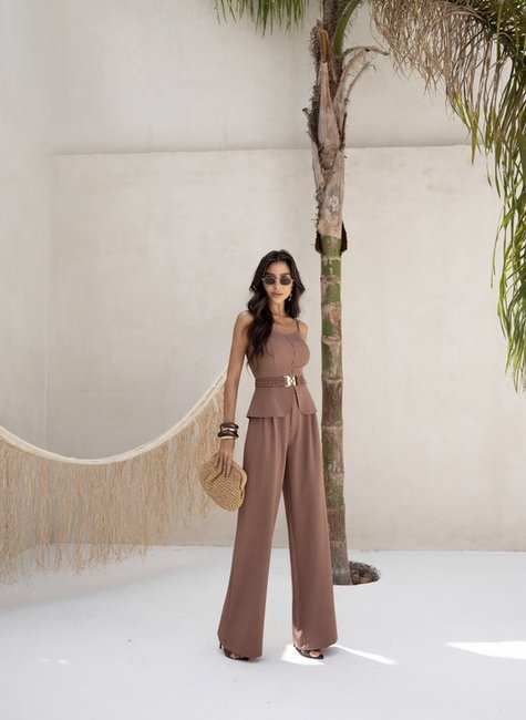 A modelagem é impecável, com recortes estratégicos que desenham o corpo sem marcar. A blusa estruturada com detalhe peplum e o elástico embutido na faixa trazem sustentação e conforto, enquanto a pantalona apresenta cintura alta e pernas amplas — ideal para um visual refinado e equilibrado.