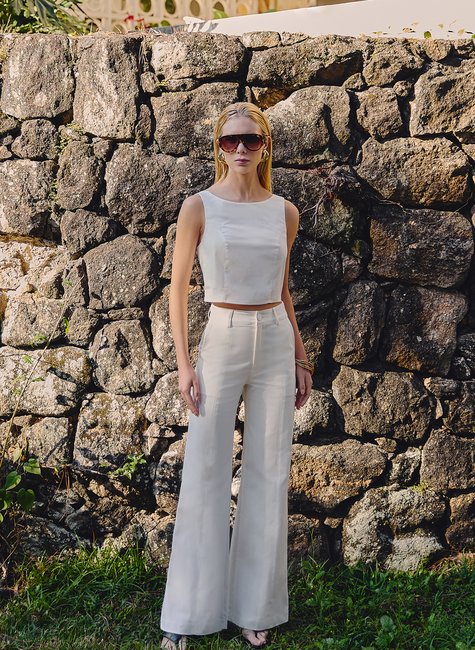 Conjunto em sarja leve e estruturada, composto por uma regata de alças largas com fivelas ajustáveis nas costas e uma calça de cintura alta com modelagem pantalona. A regata possui caimento reto e moderno, destacando os ombros e a postura com sofisticação. A calça é alongada, com cintura marcada e caimento impecável, valorizando a silhueta de forma fluida e confortável.