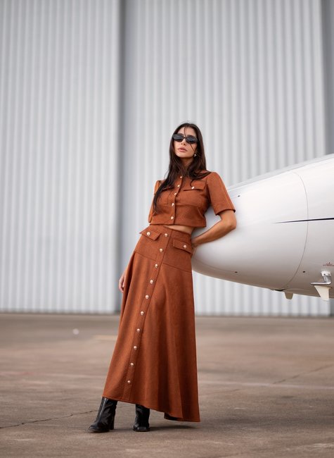 Tecido: Suede texturizado encorpado com toque macio. Fechamento: Botões frontais com detalhe metálico que agregam sofisticação. Modelagem do cropped: Estruturada com mangas curtas, bolsos frontais e comprimento na medida certa. Modelagem da saia: Longa, evasê, com cintura marcada e caimento fluido. Detalhes: Recortes estratégicos e bolsos decorativos que valorizam o design.