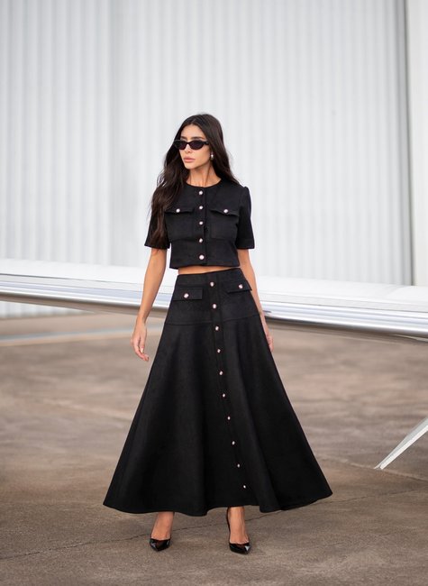 Tecido: Suede texturizado encorpado com toque macio. Fechamento: Botões frontais com detalhe metálico que agregam sofisticação. Modelagem do cropped: Estruturada com mangas curtas, bolsos frontais e comprimento na medida certa. Modelagem da saia: Longa, evasê, com cintura marcada e caimento fluido. Detalhes: Recortes estratégicos e bolsos decorativos que valorizam o design.