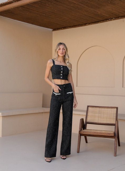 O top apresenta um corte moderno e estiloso, com detalhes que o destacam. Possui alças largas que proporcionam suporte e conforto, enquanto o design justo valoriza a silhueta feminina. O destaque fica por conta dos botões frontais, que não apenas acrescentam um toque de charme, mas também permitem um ajuste personalizável. O acabamento cuidadoso e as costuras bem feitas conferem um toque de sofisticação, tornando-o perfeito para ser usado sozinho ou sob um blazer. A calça é feita no mesmo tecido tweed e possui uma modelagem ajustada com corte reto, que favorece todos os tipos de corpo. O cós é alto, valorizando a cintura e garantindo um caimento elegante. Os botões frontais no top, que se harmonizam com os da calça, criam um efeito visual coeso e sofisticado. Os bolsos frontais adicionam funcionalidade, enquanto a fluidez do tecido permite liberdade de movimento. Disponível em uma paleta de cores sóbrias e elegantes, que variam de tons neutros a opções mais ousadas, permitindo que você escolha aquela que melhor reflete seu estilo pessoal.