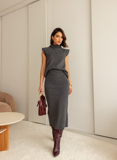 Tecido: Tricô macio e estruturado. Modelagem: Slim fit, com blusa de caimento reto e gola alta. Detalhes: Acabamento canelado discreto que traz textura ao conjunto. Comprimento: Saia midi levemente ajustada, com movimento elegante. Blusa sem mangas, ideal para sobreposições ou uso em dias mais amenos.