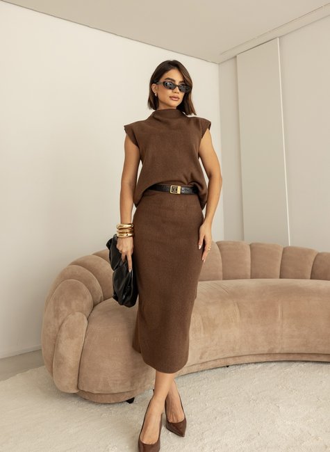 Tecido: Tricô macio e estruturado. Modelagem: Slim fit, com blusa de caimento reto e gola alta. Detalhes: Acabamento canelado discreto que traz textura ao conjunto. Comprimento: Saia midi levemente ajustada, com movimento elegante. Blusa sem mangas, ideal para sobreposições ou uso em dias mais amenos.