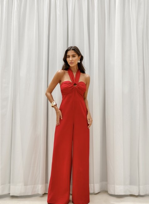 Modelagem ajustada ao corpo, com comprimento Design frente única com amarração nas costas, criando um decote atraente, que valoriza o colo e os ombros. Detalhe central com argola metálica, que traz um toque de modernidade e sofisticação ao modelo. Calça com pernas amplas e corte reto, proporcionando fluidez e movimento ao look. Cintura alta ajustada, que alonga a silhueta e valoriza as formas.Confeccionado em tecido leve e com excelente caimento, ideal para quem busca conforto aliado à sofisticação. Toque macio e acabamento impecável, garantindo elegância em cada detalhe.
