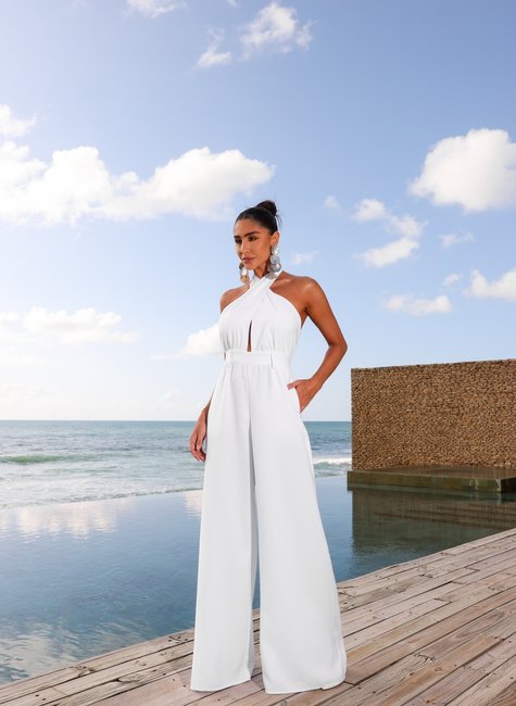 Este macacão apresenta um corte sofisticado com a frente única, que realça os ombros e o colo, criando uma silhueta alongada e graciosa. A versatilidade do design permite que você amarre o pescoço de diferentes formas, seja em um laço delicado ou em um estilo mais solto, adaptando o visual conforme a ocasião e seu estilo pessoal. Na parte das costas, um elástico no cós proporciona um ajuste confortável e flexível, acentuando a cintura e garantindo um caimento perfeito. Isso permite liberdade de movimento, tornando-o ideal para festas, eventos ou até mesmo para um dia casual. O fechamento em zíper na lateral facilita o vestir e despir, garantindo praticidade sem comprometer a estética da peça. Os bolsos laterais adicionam um toque funcional, permitindo que você carregue pequenos itens de forma discreta e prática.