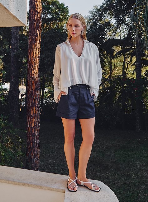 Combine com tênis para um visual casual ou aposte em sandálias para uma produção mais refinada. Acrescente acessórios metálicos para valorizar ainda mais o botão destaque da peça.