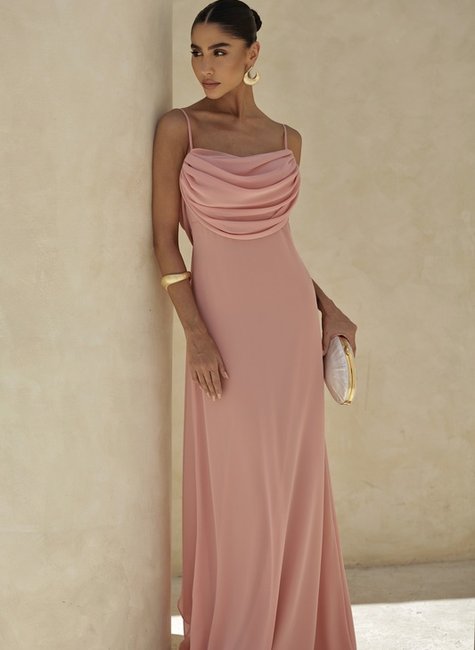 * O vestido possui comprimento longo com design atemporal, alças finas e delicadas que trazem leveza ao visual e um drapeado elegante tanto na parte frontal quanto nas costas. O detalhe especial fica por conta da parte traseira, que apresenta um decote profundo com acabamento em calda fluida, criando um movimento sofisticado e cheio de charme a cada passo.