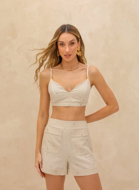 O decote V, projetado para realçar tanto o busto quanto o bordado e adicionar um toque de charme. Feito de linho, um tecido natural conhecido por sua respirabilidade e leveza. O linho confere ao top uma textura fresca e confortável, ideal para climas quentes e estações mais quentes. O bordado é meticulosamente aplicado, criando uma superfície visualmente rica e detalhada que contrasta com o fundo liso do linho. Possui elástico nas costas proporcionando conforto e alcinhas com reguladores.