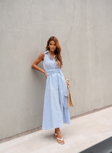 Elegância e leveza definem este vestido chemise, perfeito para dias ensolarados e ocasiões casuais com um toque sofisticado. Confeccionado em tecido leve com listras finas em azul e branco, ele traz um visual fresco, atemporal e super feminino.