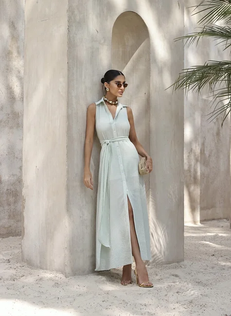 O modelo sem mangas conta com gola tradicional e abotoamento frontal completo, garantindo praticidade e um caimento impecável. Acompanha uma faixa do mesmo tecido, que valoriza a cintura e permite diferentes amarrações — ideal para ajustar o look conforme o seu estilo.